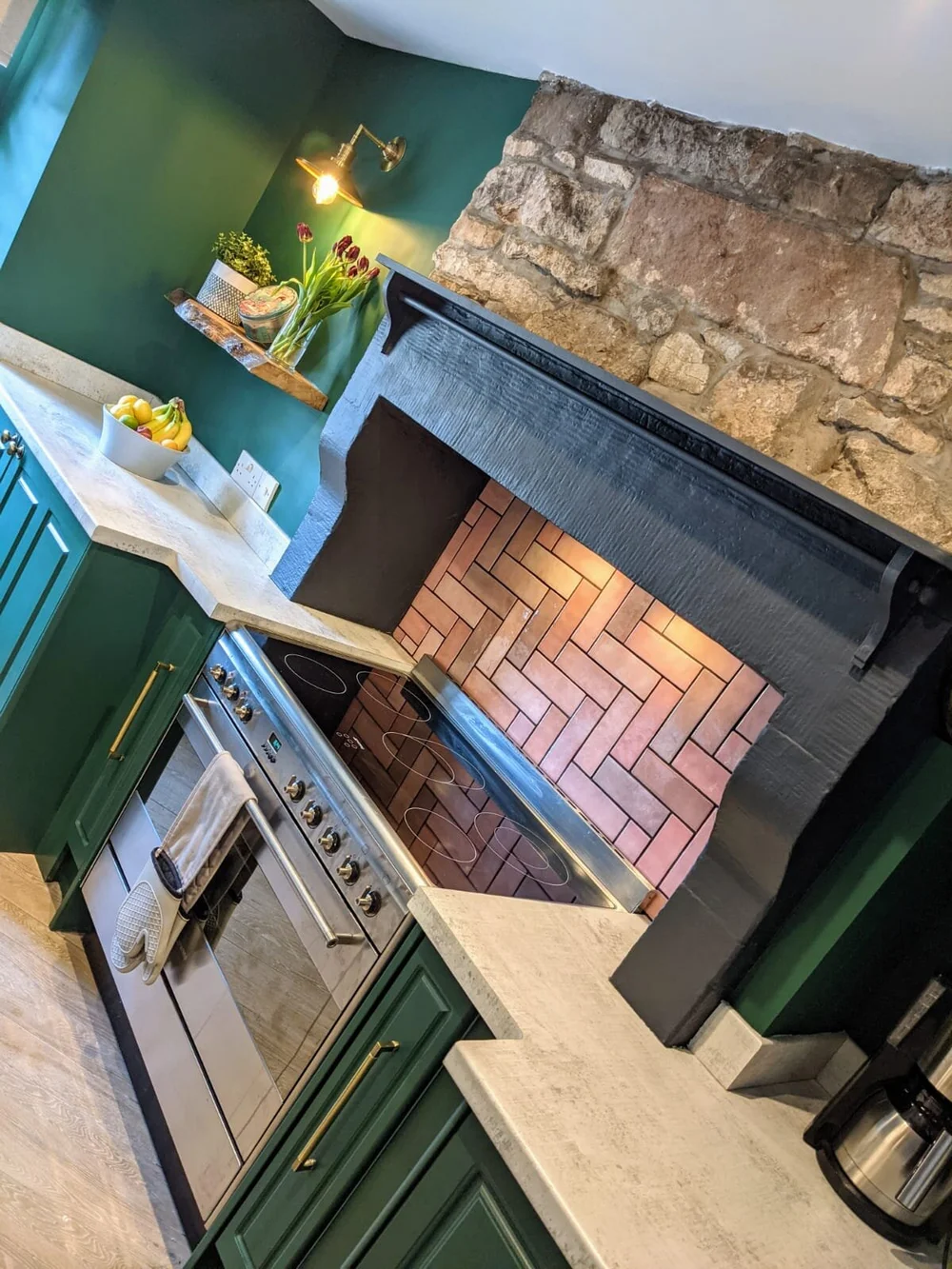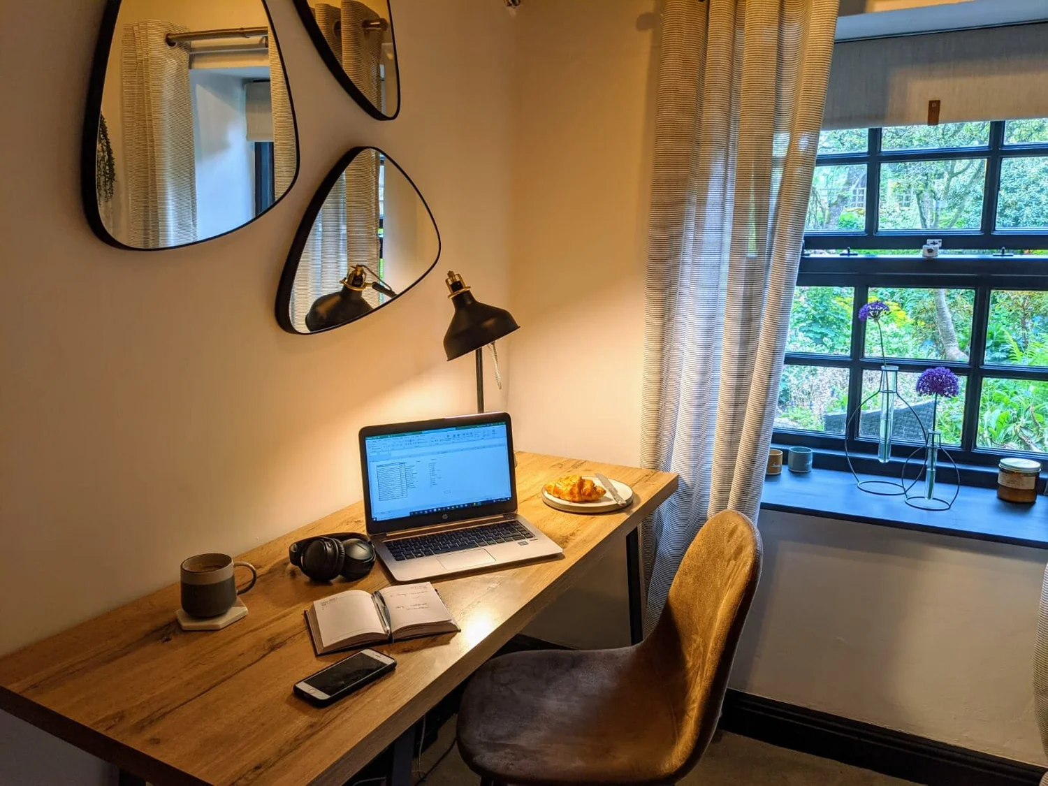 There is also an open wood-burning fireplace for those winter months. If you still need to get work done, there is a quiet corner that includes a desk and work chair, making it the perfect spot to work (and gaze out into the garden).